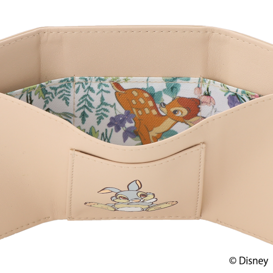 女性らしいベージュの色をベースに、『バンビ』の作品の世界を三つ折り財布に表現しています。内側、特にお札入れの裏地などにもキャラクターが登場。大人の女性のためのウォレットです。
