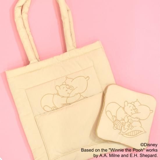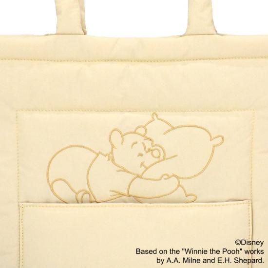 お布団やクッションのような優しい触り心地が特徴のパデッドトートバッグです。もこもことした質感と眠った「プーさん」がとにかくかわいいデザインです。