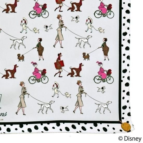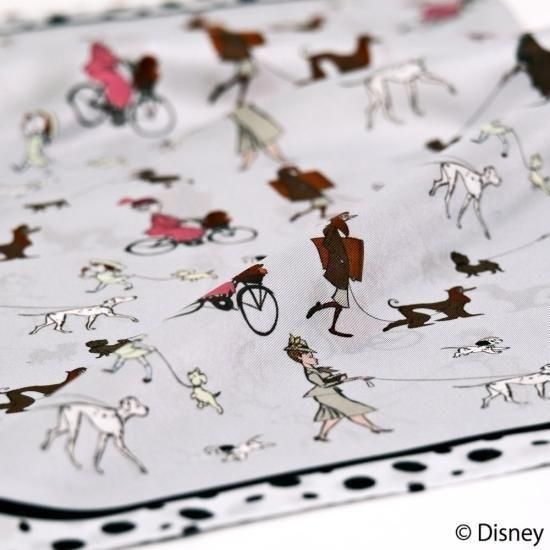『101匹わんちゃん』の世界観を感じられる日本製のシルクスカーフが登場です。犬の散歩をイメージしており、犬と飼い主はどこか似ているというユーモアと愛らしさに溢れたデザインとなっております。スカーフの端には「パーディタ」の首輪をイメージしたチャームが描かれているのもポイントです。