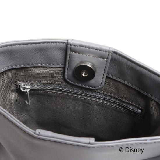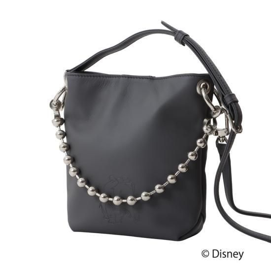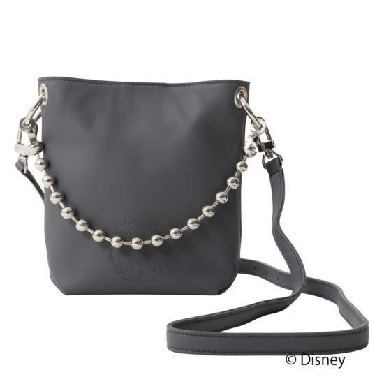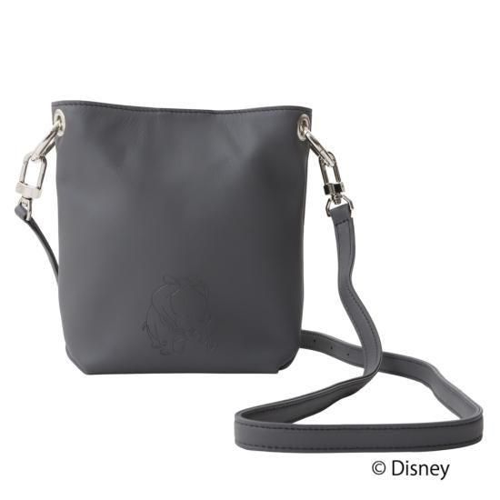 季節を問わず使いやすいマットな質感のグレーのレザーを使用。「ダンボ」の特徴である大きな耳を頭の上で結んだ姿がキュートな、ファン必見のバッグです。