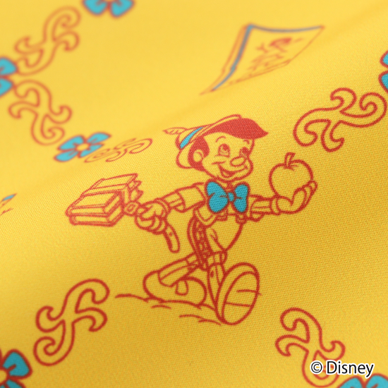 ”ピノキオ”の帽子のイエローの色をベースに、『ピノキオ』の作品の世界を巾着に表現しています。