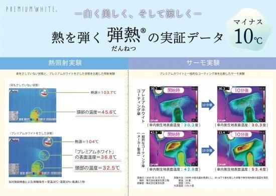 生地には『プレミアムホワイトパール』を使用。弾熱性・遮熱性に優れ、実際に体感9度以上涼しく感じるなどサーモ実験にて効果が実証されています。